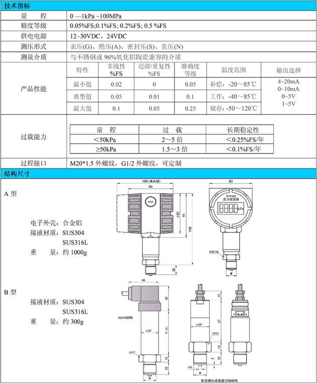 wp402型壓力變送器選用進Kou、高精度帶防腐膜片敏感組件,該組件將固態集成工藝與隔離膜片技術結合在起,產品被設計成可在惡劣環境下工作仍保持優良的性能。該產品用來進行溫度補償的電阻被制作在混合陶瓷基片上,敏感組件在補償溫度范圍內-20~85C)提供了小的溫度誤差0.25%FS(Zui大值),抗干擾能力強,適于遠距離傳輸。